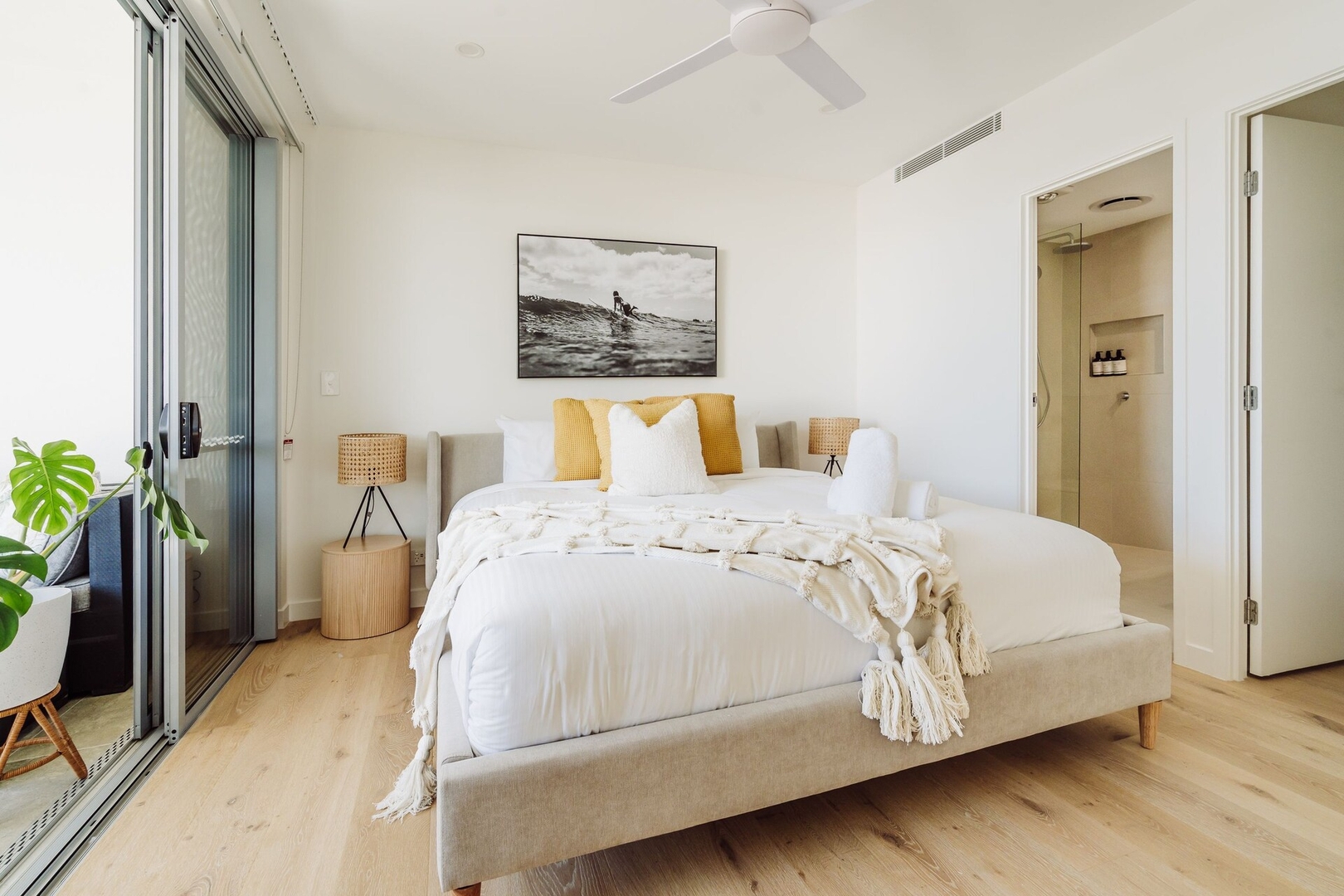 Just off the living room is your master suite with a luxuriously comfy king bed, a beautifully presented ensuite with boutique toiletries provided, a walk-in robe, and large sliding doors leading to the deck.
