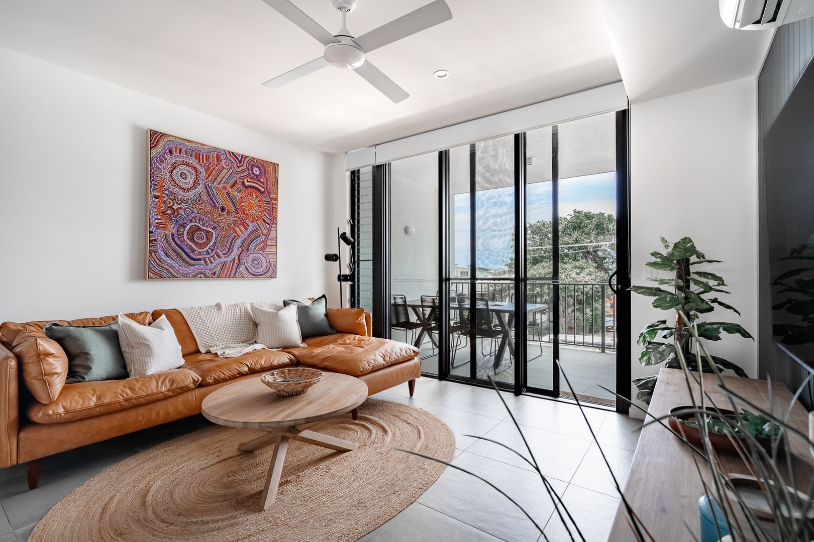 Walk into the upstairs suite and a beautifully styled, modern space greets you. The fully stocked kitchen has everything you need and a round dining table to pull up your chairs. A lounge area with a TV for movie nights opens up to a deck for alfresco eating and BBQ.